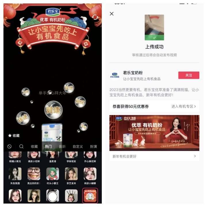 除了用戶喜聞樂見的直播欄目流量加持之外,優(yōu)萃有機奶粉還充分借勢品牌卡券植入從攻占用戶心智到構建雙方鏈接。如在放煙花、猜燈謎、拍新年視頻等創(chuàng)意互動中,使得優(yōu)萃有機奶粉的品牌信息在活動頁面多次露出,讓用戶潛移默化對品牌產生認同與共鳴,無形中為品牌帶去巨大的人群增量和品牌曝光量。與此同時,用戶心智強種草對品牌后續(xù)的銷售也起到了關鍵的推動作用,對此優(yōu)萃有機奶粉直擊落地銷售轉化,以大幅優(yōu)惠更高效地激發(fā)用戶購買欲,例如通過游戲獎勵的形式發(fā)放品牌優(yōu)惠券,并引導用戶進入有機專區(qū),直接帶動優(yōu)萃有機奶粉的生意轉化。