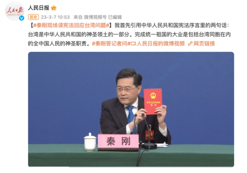 回答中美因臺(tái)灣問(wèn)題走向沖突的現(xiàn)實(shí)風(fēng)險(xiǎn)有多大的問(wèn)題時(shí),秦剛拿出一本中國(guó)憲法。他說(shuō):“我知道今天肯定要問(wèn)到臺(tái)灣問(wèn)題,特別帶來(lái)一本《中華人民共和國(guó)憲法》?!?/p>