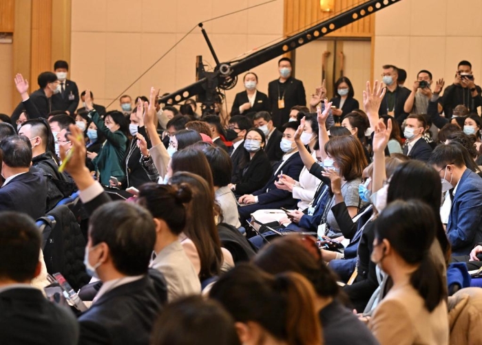 3月7日,十四屆全國(guó)人大一次會(huì)議在梅地亞中心舉行記者會(huì),外交部長(zhǎng)秦剛就中國(guó)外交政策和對(duì)外關(guān)系回答中外記者提問(wèn)。這是記者在現(xiàn)場(chǎng)舉手提問(wèn)。