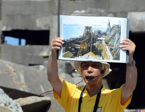 2015年8月8日,在日本長崎“軍艦島”,導(dǎo)游講解島上歷史。二戰(zhàn)期間,大量來自朝鮮半島和中國的勞工被強征到這座小島上勞動,受盡非人折磨甚至被虐致死。新華社記者馬平攝