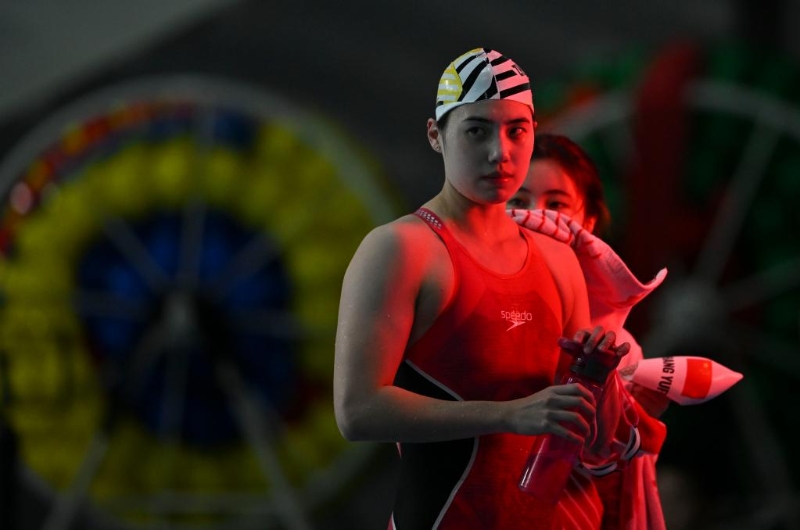 2022年10月29日,張雨霏在2022年短池世錦賽達標賽女子100米蝶泳決賽后查看成績。最終,她以55秒46的成績獲得決賽第一名。新華社記者 陶希夷 攝