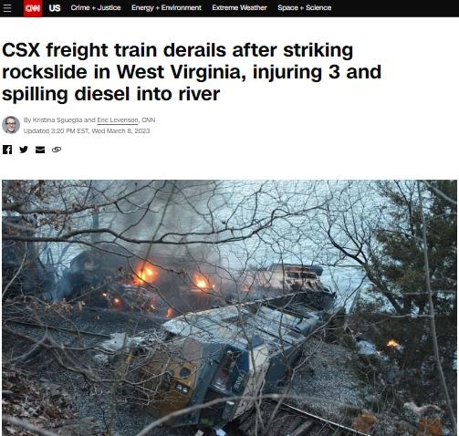 中新網(wǎng)3月9日電 據(jù)美國(guó)有線電視新聞網(wǎng)(CNN)報(bào)道,當(dāng)?shù)貢r(shí)間8日,美國(guó)東部最大的鐵路網(wǎng)絡(luò)運(yùn)營(yíng)商CSX運(yùn)輸公司在一份聲明中稱,當(dāng)天早上一列運(yùn)煤火車在西弗吉尼亞州脫軌并起火,造成車上3名列車員受傷,并導(dǎo)致柴油泄露到附近河流中。