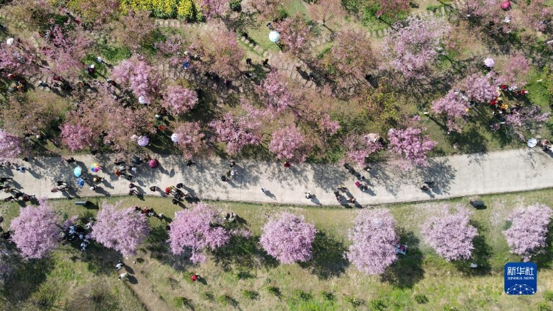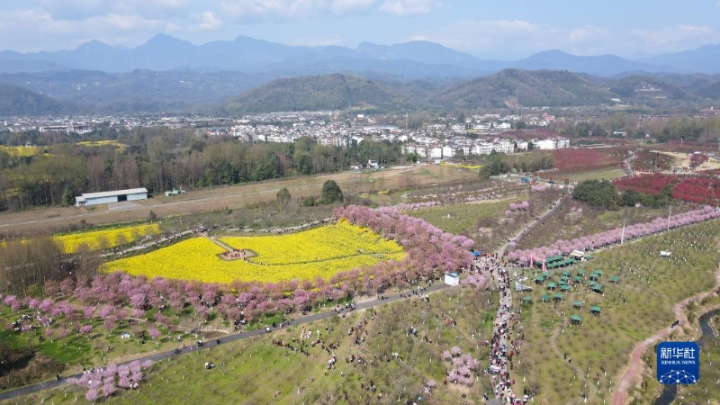 這是3月8日拍攝的都江堰市青城山鎮(zhèn)“問花村”櫻花大道一角(無人機照片)。