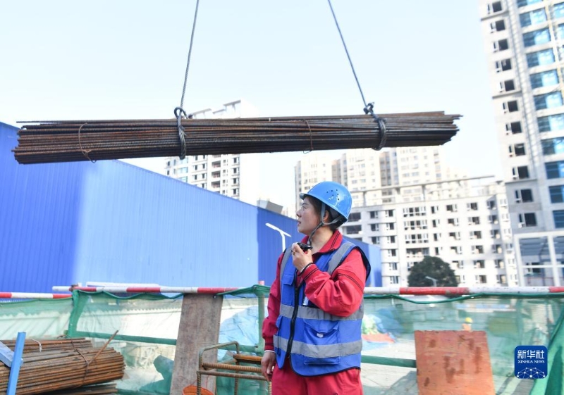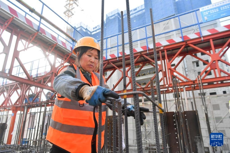 3月8日,在陜西省西安市未央區(qū)一處建筑工地,中建三局西北公司鋼筋工李華秀在施工現場工作。