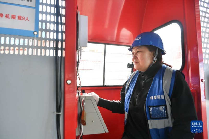 3月8日,在陜西省西安市未央區(qū)一處建筑工地,中建三局西北公司電梯司機劉會瓊在施工現場工作。