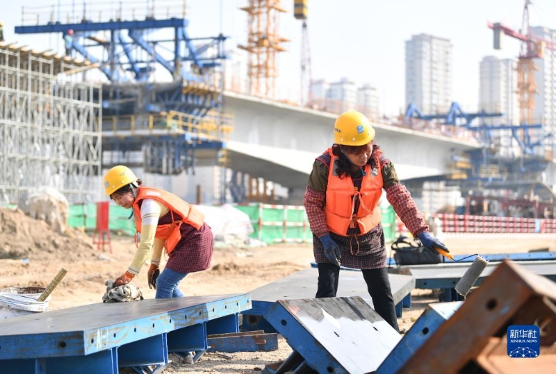 3月8日,在位于陜西省西安市國際港務區(qū)的水流路跨灞河大橋項目施工現場,中建三局西北公司模板工趙菊華(左)、汪仕英在施工現場工作。
