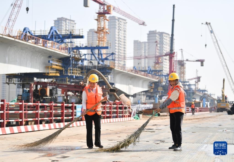 3月8日,在位于陜西省西安市國際港務區(qū)的水流路跨灞河大橋項目施工現場,中建三局西北公司工人田小葉(左)、劉雪琴在施工現場工作。