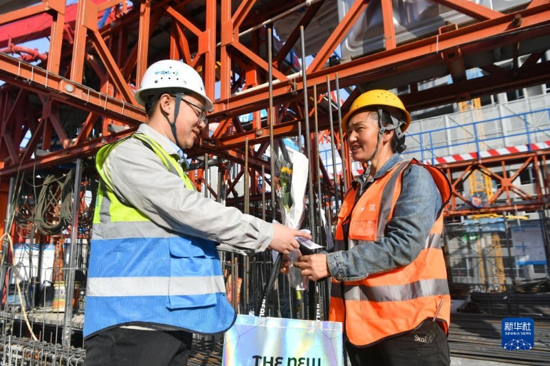 3月8日,在陜西省西安市未央區(qū)一處建筑工地,中建三局西北公司鋼筋工賈元會(右)收到項目管理人員贈送的節(jié)日禮品。
