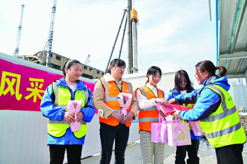 昨天,中建三局上海嗶哩嗶哩新世代產(chǎn)業(yè)園項(xiàng)目部工地的女工領(lǐng)取節(jié)日慰問品。新華社 圖