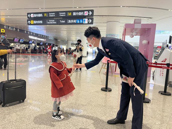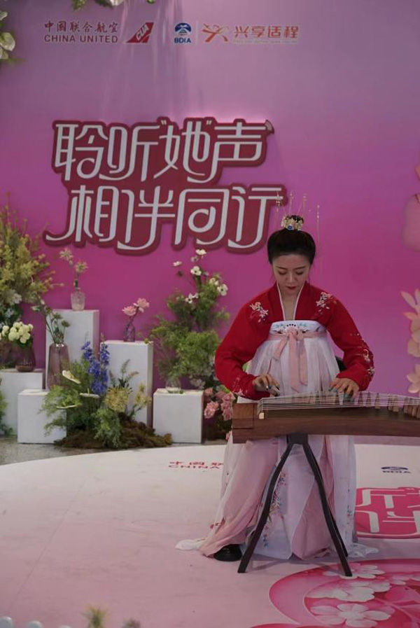 上午10時,伴隨著古箏的悠揚樂曲,活動正式拉開帷幕,身著漢服的彈奏者為旅客們獻上動人的演奏。舒緩悠揚的琴聲沁人心脾,聽來如沐春風,當“音樂”遇上“國際勞動婦女節(jié)”,節(jié)日的美好氛圍更加濃郁。來自中國聯(lián)合航空的男性員工手持玫瑰花、連同寫著祝福的賀卡等禮品,送給來往的女性旅客,為她們送上最誠摯的問候和祝福。
