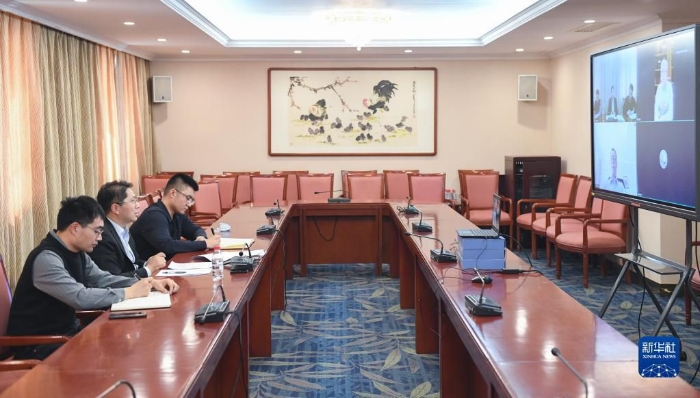 3月8日,科技部成果轉(zhuǎn)化與區(qū)域創(chuàng)新司二級巡視員陳宏生(左二)和他的兩位同事在科技部與全國政協(xié)委員隆克平等視頻連線。新華社記者 戴天放 攝