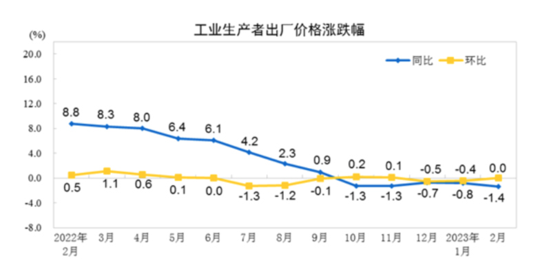 從工業(yè)生產(chǎn)者價(jià)格看,2月份,工業(yè)企業(yè)生產(chǎn)恢復(fù)加快,市場(chǎng)需求有所改善,PPI環(huán)比由上月下降0.4%轉(zhuǎn)為持平。
