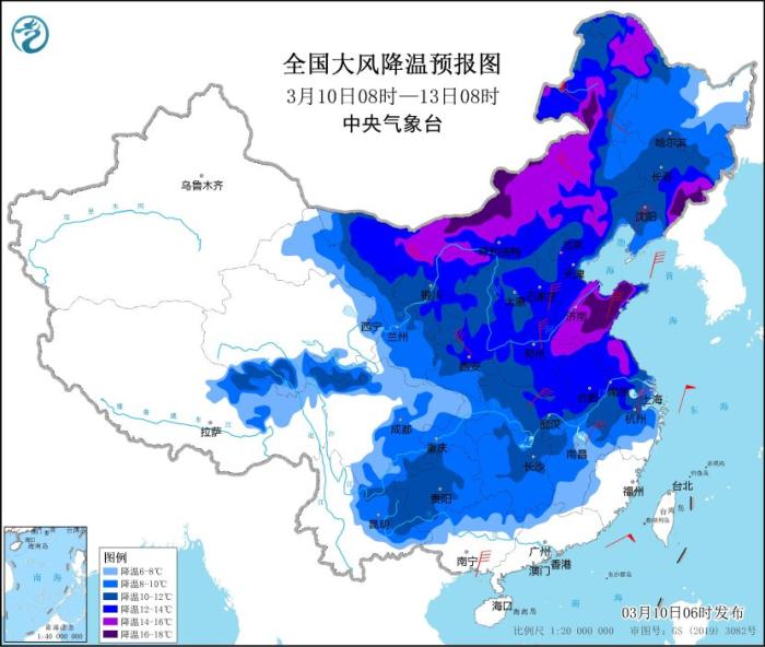 受寒潮影響,預(yù)計,3月10日08時至3月13日08時,中東部大部地區(qū)氣溫下降6~10℃,內(nèi)蒙古、華北、黃淮、江淮東部等地氣溫下降12℃,局部超過16℃,上述地區(qū)先后有4~6級風(fēng),陣風(fēng)7~9級,部分地區(qū)并伴有沙塵天氣。我國近海大部海域有6~8級風(fēng),陣風(fēng)9~11級。過程最低氣溫出現(xiàn)在13日早上,最低氣溫0℃線將位于陜西南部、河南西部、河北南部到天津一線,山東東部和江蘇東北部最低氣溫也將達到0℃左右。