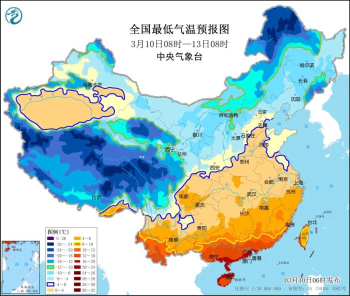 圖3 全國最低氣溫預(yù)報圖(3月10日08時-13日08時)