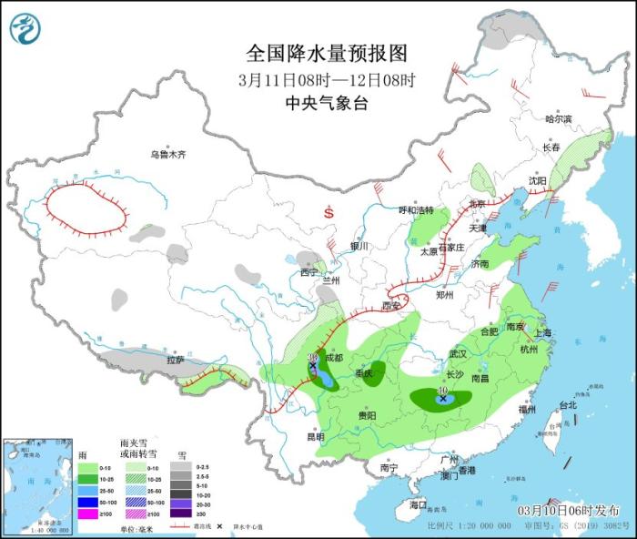 圖6 全國降水量預(yù)報圖(3月10日08時-11日08時)