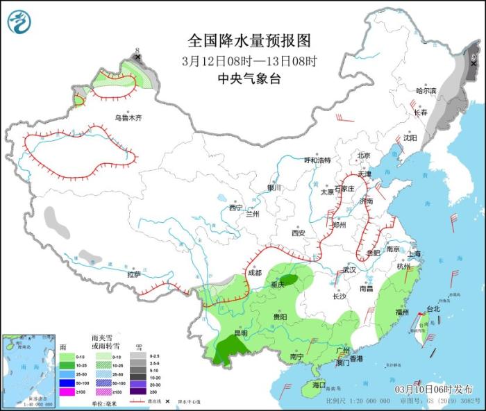 3月10日08時至11日08時,內(nèi)蒙古東北部、黑龍江西北部、西藏東部和南部、青海東部、甘肅河西地區(qū)、川西高原北部等地部分地區(qū)有小到中雪或雨夾雪,其中,內(nèi)蒙古東北部、黑龍江西北部等地部分地區(qū)有大到暴雪(10~17毫米)。西藏東南部、甘肅南部、四川西部和北部、重慶、貴州、湖北南部、湖南中北部、江西中西部、山東半島等地部分地區(qū)有小到中雨,局地有大雨(25~40毫米)。內(nèi)蒙古中東部、東北地區(qū)西部、華北、山東半島等地部分地區(qū)有4~6級風(fēng),其中,內(nèi)蒙古東北部等地部分地區(qū)有7~8級風(fēng)(見圖6)。
