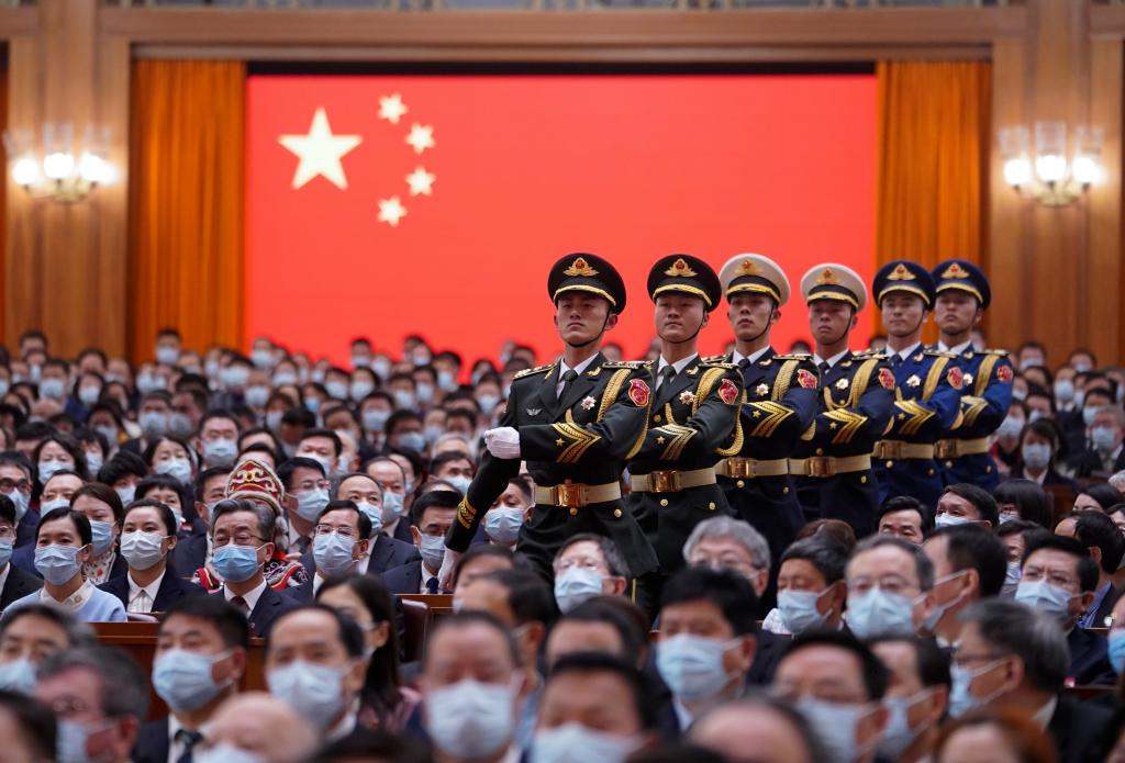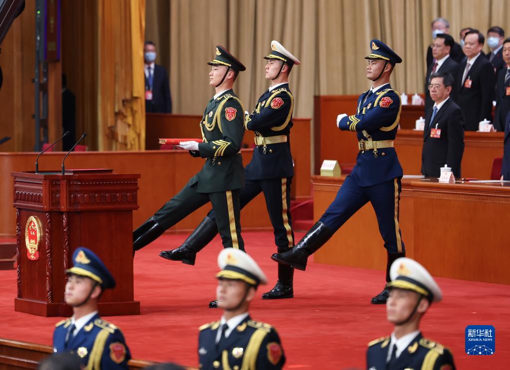 3月10日,中華人民共和國第十四屆全國人民代表大會(huì)第一次會(huì)議憲法宣誓儀式在北京人民大會(huì)堂舉行。主席臺(tái)上,3名禮兵邁著正步護(hù)送《中華人民共和國憲法》入場(chǎng)。