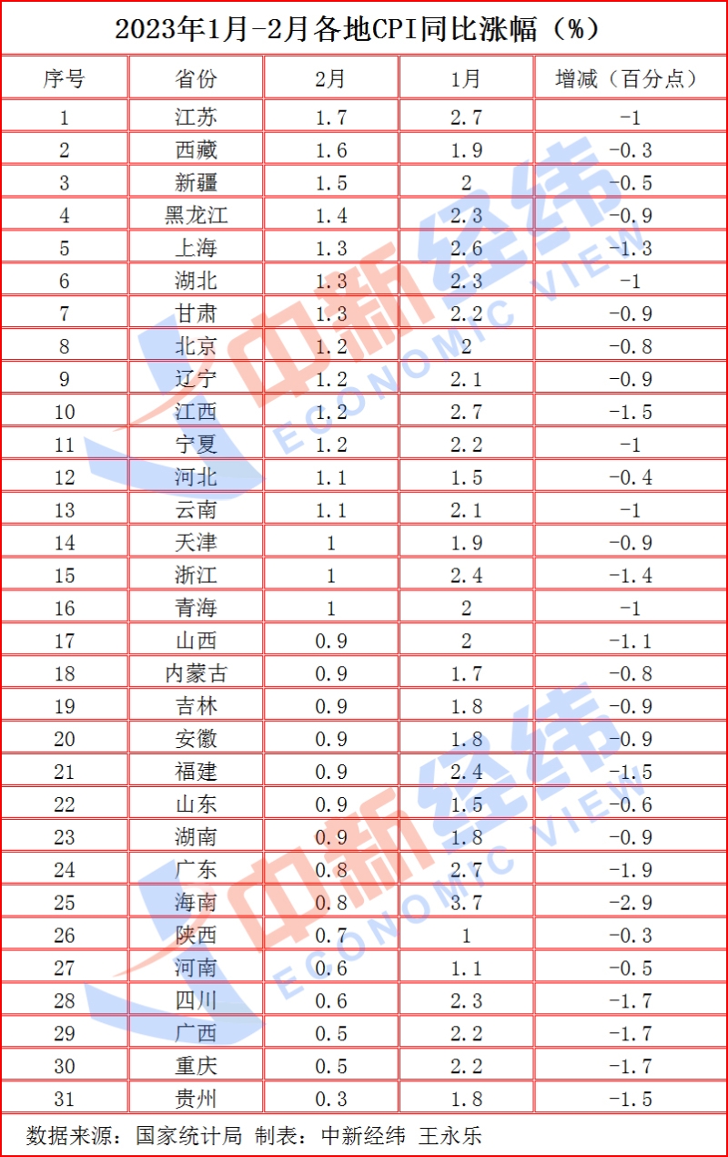 中新經(jīng)緯3月11日電 (王永樂)日前,國家統(tǒng)計局公布了31省份2023年2月居民消費價格指數(shù)(CPI)。中新經(jīng)緯梳理發(fā)現(xiàn),2月,31省份CPI同比漲幅均低于上月。其中,江蘇最高為漲1.7%,貴州最低漲0.3%。