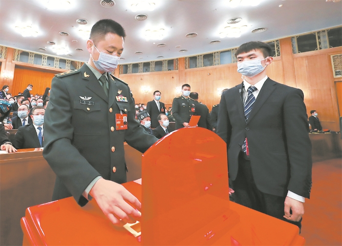 3月10日,十四屆全國(guó)人大一次會(huì)議在北京人民大會(huì)堂舉行第三次全體會(huì)議。 圖為軍隊(duì)人大代表在投票。新華社記者 丁林 攝
