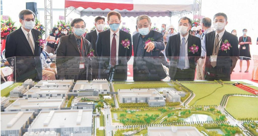 臺(tái)積電董事長(zhǎng)劉德音(左三)觀看臺(tái)積南科廠房模型,南科廠曾因施工不慎斷電,晶圓蒙受損失。(圖/臺(tái)積電提供)