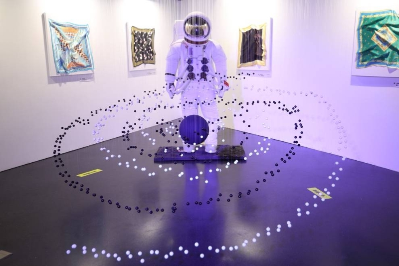 展覽共分為四個(gè)展區(qū),均以“奢品美學(xué)定制絲巾”進(jìn)行貫穿,用以闡述每個(gè)展區(qū)的主題。展區(qū)一為“保時(shí)捷美學(xué)”主題絲巾展,以明亮的色彩表達(dá)“跑車(chē)”的靈動(dòng)感;展區(qū)二創(chuàng)意地從空中懸掛耳麥,讓參展的人們可以自由地佩戴耳麥,傾聽(tīng)來(lái)自產(chǎn)品的“故事”;展區(qū)三展覽的絲巾以“NASA”為主題,表達(dá)科幻與高級(jí)的結(jié)合,還運(yùn)用裝置藝術(shù)形式繪制了一幅立體的星際圖案與星空夢(mèng)幻產(chǎn)生連接,讓夢(mèng)想穿越成生活的組成部分;展區(qū)四以“菲拉格慕香氛”為主題,包括絲巾展、氣球懸掛香片展,以絲巾從視覺(jué)上帶來(lái)輕奢效果,以香片從味覺(jué)上帶來(lái)明媚生活的愉悅感。同時(shí),每款絲巾都帶來(lái)細(xì)膩的、如肌膚般的觸感,讓觸覺(jué)的高級(jí)可以被真實(shí)體驗(yàn)到。