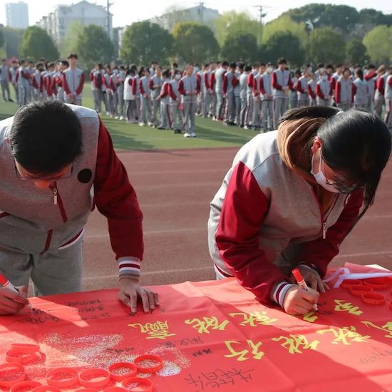 全體初三學(xué)生在鮮紅的戰(zhàn)旗上簽名,立下“軍令狀”。在戰(zhàn)旗的引領(lǐng)下,在激昂的音樂聲中,斜塘學(xué)子們的步伐矯健整齊,堅(jiān)定有力。