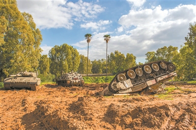 照片中,兩輛以色列“梅卡瓦”Ⅲ主戰(zhàn)坦克正在進行“復雜地形條件下”作戰(zhàn)演練。不知何故,右前這輛“梅卡瓦”Ⅲ主戰(zhàn)坦克倒扣在淤泥里,動彈不得。不遠處,一輛美制M88A2“大力士”裝甲搶救車正準備對其“施以援手”。