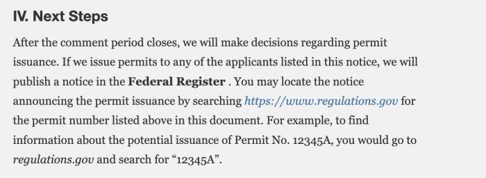 據(jù)介紹,公示期結(jié)束后,美國(guó)魚(yú)類(lèi)及野生動(dòng)物管理局將發(fā)放許可證,并在《聯(lián)邦公報(bào)》上發(fā)布通知。屆時(shí),可憑借許可證號(hào)碼,登陸美國(guó)政府文件網(wǎng)站(www.regulations.gov)查詢(xún)?cè)S可通知。