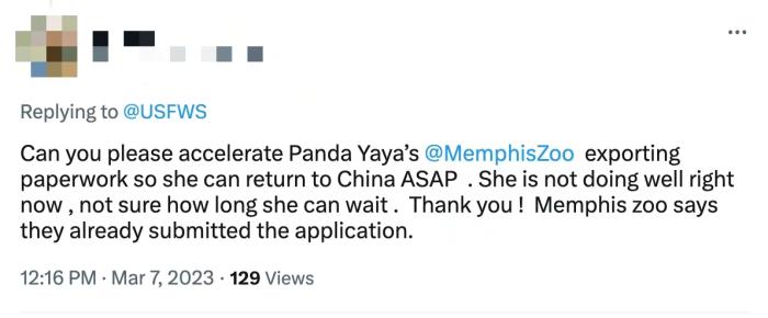 有網(wǎng)友表示:“丫丫現(xiàn)在的狀態(tài)不是很好,不知道她還能等多久?!痹摼W(wǎng)友呼吁美國(guó)魚(yú)類(lèi)與野生動(dòng)物管理局盡快處理孟菲斯動(dòng)物園提交的的申請(qǐng),讓“丫丫”盡快回到中國(guó)。