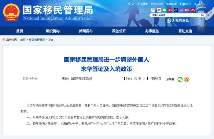 中新網(wǎng)3月14日電 據(jù)國(guó)家移民管理局網(wǎng)站消息,為更好統(tǒng)籌疫情防控和經(jīng)濟(jì)社會(huì)發(fā)展需要,便利中外人員往來(lái),國(guó)家移民管理局決定自2023年3月15日零時(shí)起調(diào)整簽證及入境政策。