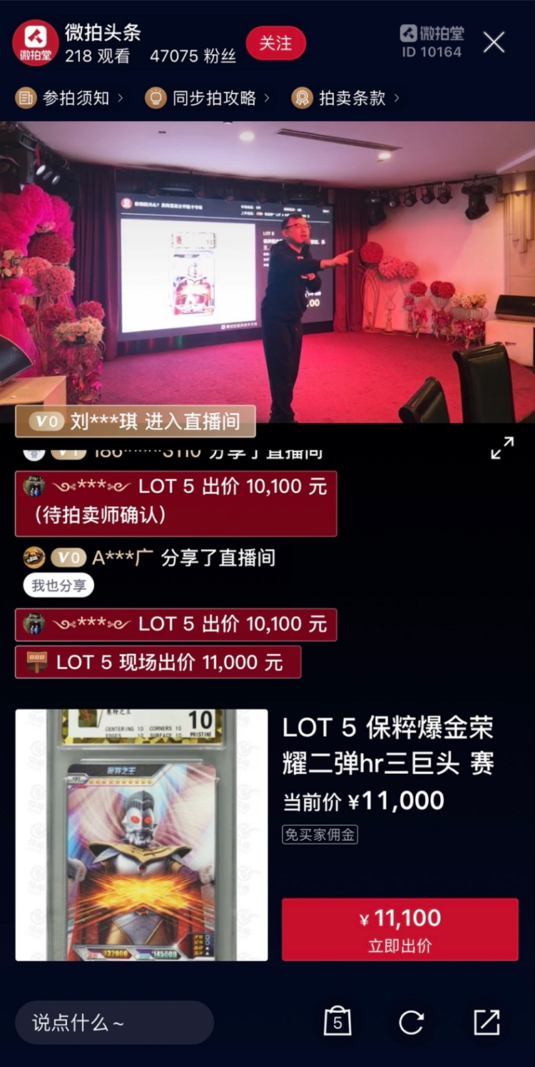 晚宴期間,微拍堂官方直播間「微拍頭條」提供了線上線下同步競拍環(huán)節(jié),為此次博覽會帶來了不一樣的收藏卡文化體驗。值得一提的是,作為hr卡種收藏畢業(yè)選項之一的「榮耀二彈三巨頭」卡牌,由于暴金品相三張收集難度極高的原因,成為當晚競拍環(huán)節(jié)的主角。