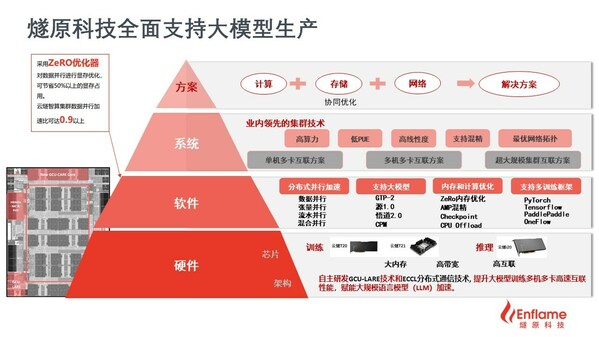在大模型標(biāo)桿項目落地經(jīng)驗指引下,以大幅縮短大模型開發(fā)與應(yīng)用周期為目標(biāo),針對大模型場景下的算力需求特性,燧原科技現(xiàn)已針對大模型場景形成從硬件、軟件、系統(tǒng)方案的全棧技術(shù),全面支持大模型生產(chǎn),包括但不僅限于: