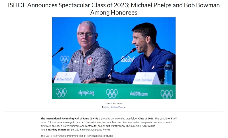 中新網(wǎng)3月15日電 近日,國(guó)際游泳名人堂公布了2023年入堂成員名單,美國(guó)名將菲爾普斯、中國(guó)跳水奧運(yùn)冠軍吳敏霞、日本蛙泳名將北島康介等人在列。據(jù)介紹,儀式將于9月30日在美國(guó)勞德戴爾堡舉行。