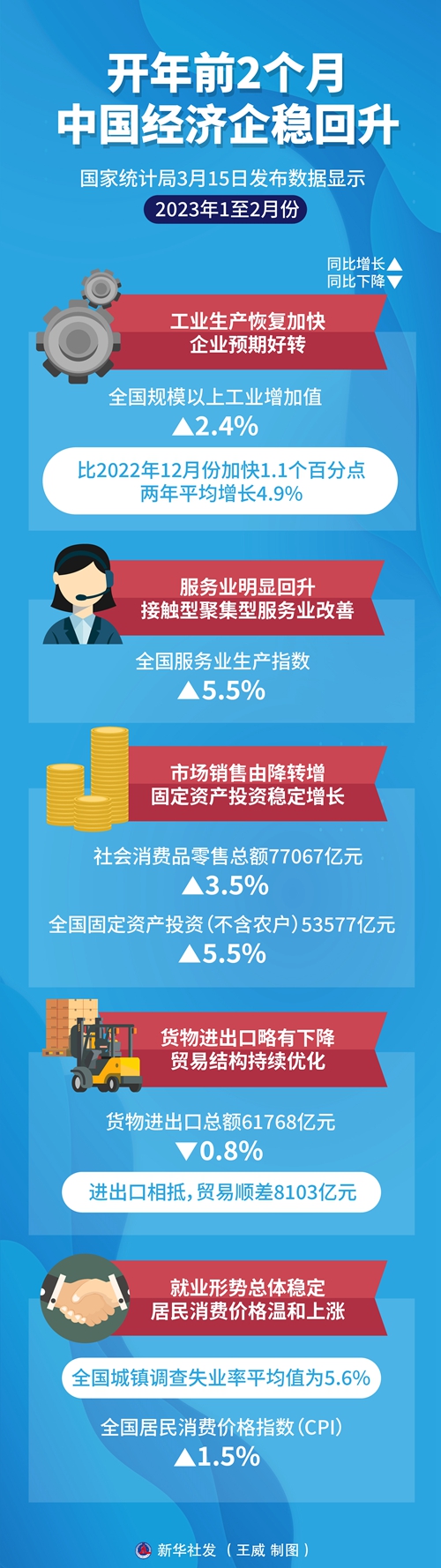 新華社北京3月15日電(記者魏玉坤、韓佳諾)國家統(tǒng)計局15日發(fā)布數(shù)據(jù)顯示,今年1至2月份,隨著疫情防控較快平穩(wěn)轉(zhuǎn)段,穩(wěn)經(jīng)濟(jì)政策效果持續(xù)顯現(xiàn),多項經(jīng)濟(jì)指標(biāo)回升向好,經(jīng)濟(jì)運(yùn)行整體呈現(xiàn)企穩(wěn)回升態(tài)勢。