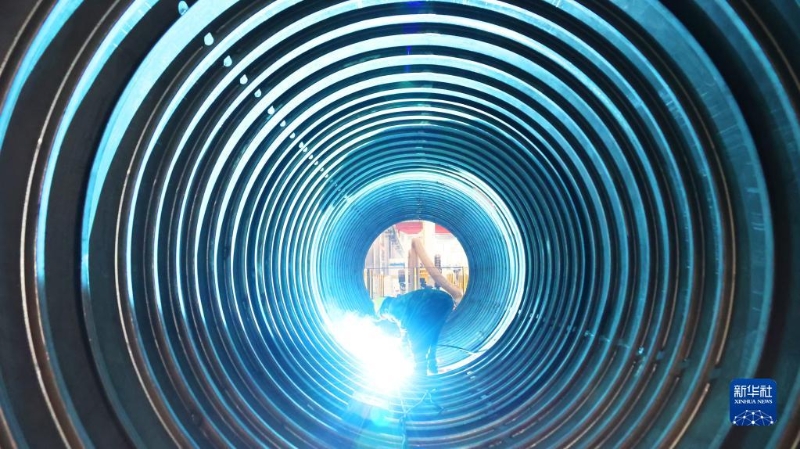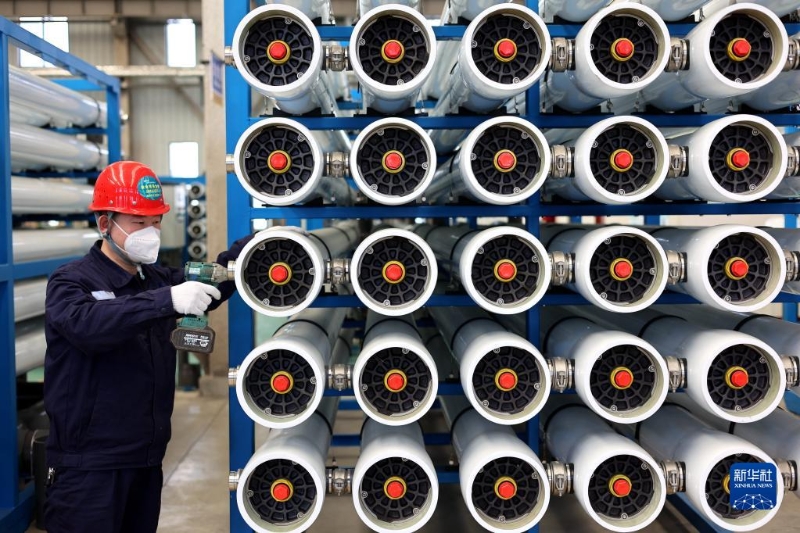 3月14日,工人在山東省濱州市惠民縣辛店鎮(zhèn)一家水處理設(shè)備生產(chǎn)企業(yè)車間內(nèi)生產(chǎn)純水反滲透膜殼。新華社發(fā)(初寶瑞攝)