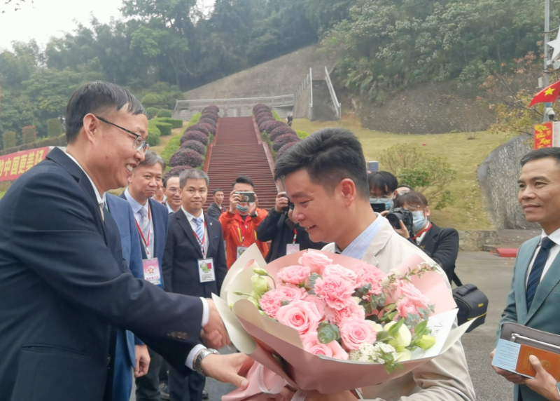 中方工作人員給越南游客送上鮮花。新華社記者梁舜 攝