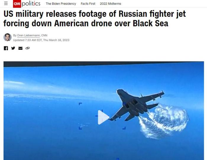 報道還稱,當(dāng)俄羅斯蘇-27戰(zhàn)斗機(jī)再次靠近時,又一次“傾倒燃料”。隨后,俄羅斯蘇-27戰(zhàn)斗機(jī)與美國MQ-9“死神”無人機(jī)“相撞”,導(dǎo)致螺旋槳受損,無人機(jī)的視頻也由此中斷。不過,CNN同時指出,俄羅斯否認(rèn)發(fā)生了“碰撞”。