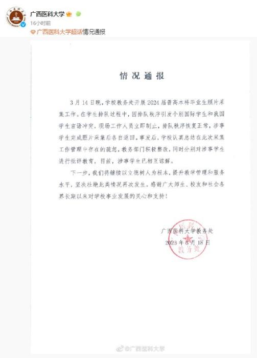 通報稱,3月14日晚,學(xué)校教務(wù)處開展2024屆普高本科畢業(yè)生照片采集工作。在學(xué)生排隊過程中,因排隊秩序引發(fā)個別國際學(xué)生和中國學(xué)生言語沖突,現(xiàn)場工作人員立即制止,排隊秩序恢復(fù)正常,涉事學(xué)生完成照片采集后各自返回。