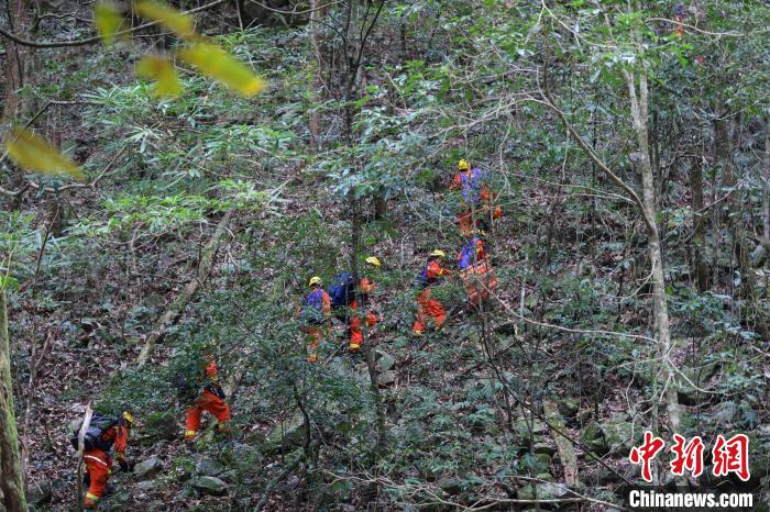 消防員在密林中尋找傷員?!±钤x 攝