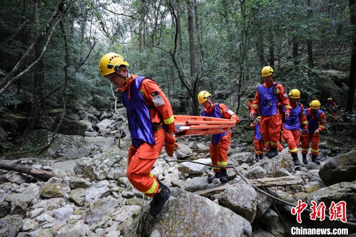 消防員將傷員從山坡往山下轉(zhuǎn)運(yùn)?!±钤x 攝