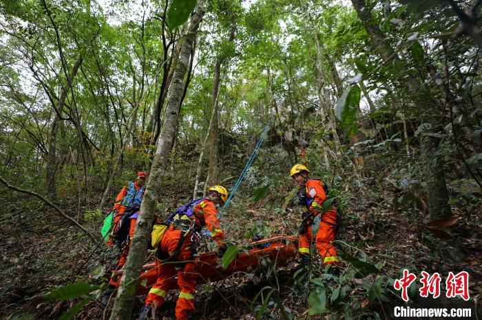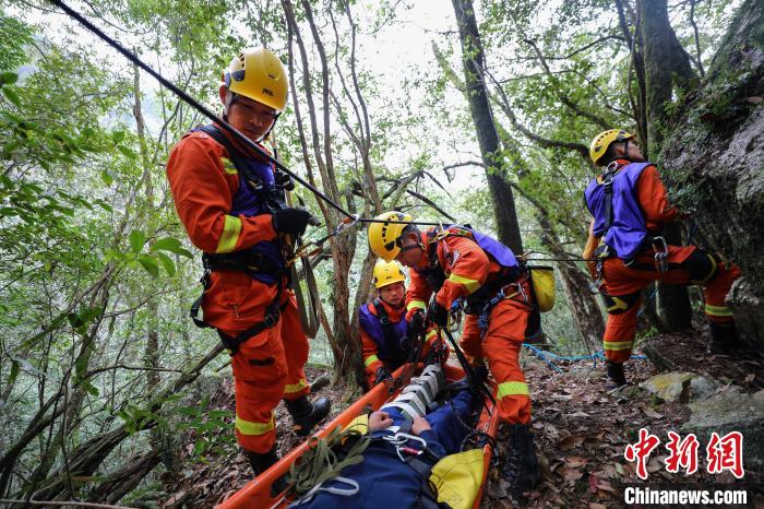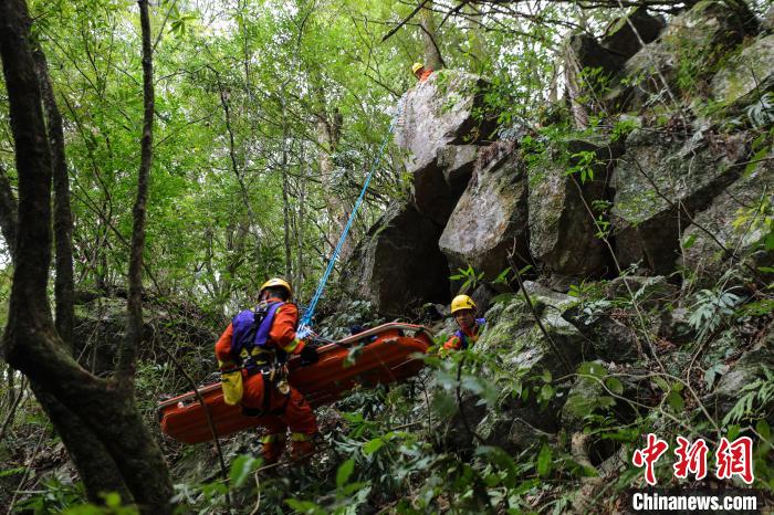消防員利用繩索將傷員下降至崖底?!±钤x 攝