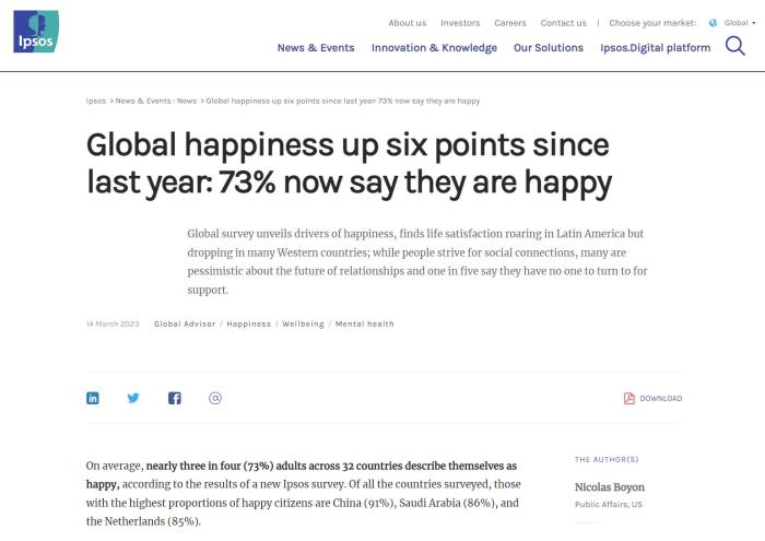調(diào)查結(jié)果顯示,平均而言,在32個(gè)國(guó)家中,近四分之三(73%)的成年人認(rèn)為自己很幸福。在所有接受調(diào)查的國(guó)家中,幸福感指數(shù)最高的國(guó)家是中國(guó)(91%),其后是沙特阿拉伯(86%)、荷蘭(85%)、印度(84%)、巴西(83%)。