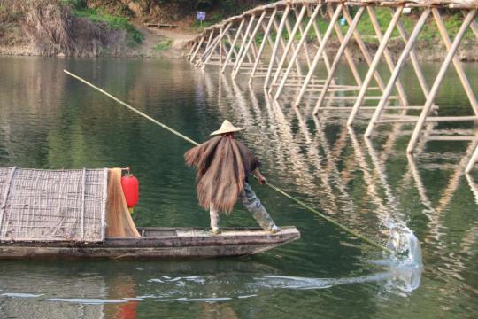 在思口鎮(zhèn)漳村的漳溪河上,漁民王利保頭戴斗笠、身披蓑衣,為游客表演劃破江水、拋撒漁網(wǎng)的動作。手持一根竹篙,腳踏一葉輕舟,王利保成了游客追捧的“網(wǎng)紅漁翁”??吹絿趵!斑青辍卑磩涌扉T的游客們,河岸邊直播賣土特產(chǎn)的姑娘、挑擔(dān)賣花的大姐,無不感嘆“漳村又熱鬧起來了”。