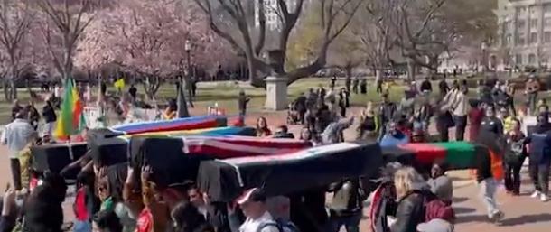 甚至有人抬著蓋有伊拉克、敘利亞、烏克蘭等國國旗的“棺材”,以此指代美國外交政策的“受害者”。