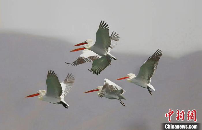 圖為3月16日拍攝到的5只卷羽鵜鶘在河北省淶源縣淶源湖上空飛翔。 中新社發(fā) 張竣哲 攝