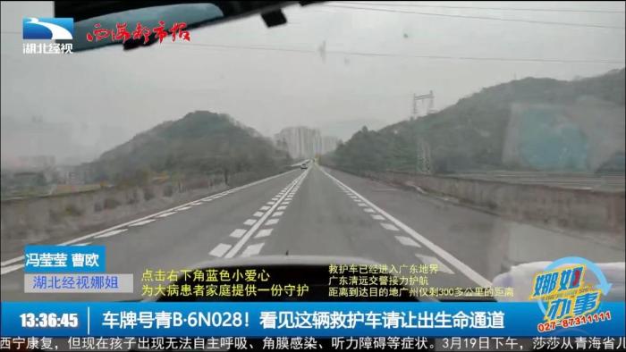 圖為莎莎所乘坐的愛心車輛進(jìn)入廣東省?!≈辈ギ嬅娼貓D