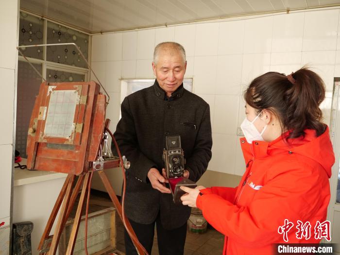 圖為程森林(左)展示老相機(jī)。 胡建華 攝