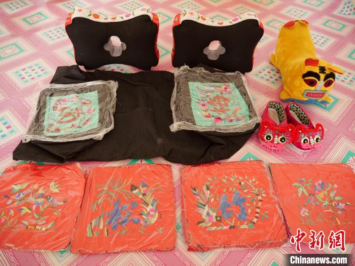 在展品中,一對嶄新的耳枕和刺繡的枕頭頂格外引人注目,這是村民劉毅瑩捐出的自己母親的得意之作。