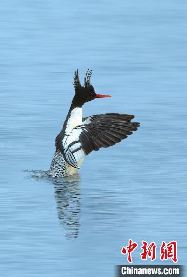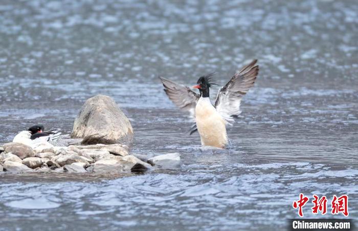 中華秋沙鴨在水中玩耍?!±钪?攝