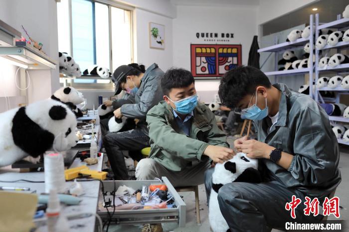 在四川成都一仿真大熊貓玩偶工作室內(nèi),羊毛、填充材料和玩偶半成品擺滿工作臺,近10名工人正專心致志俯身其間,經(jīng)過一番填充、剪毛和造型,一只只或坐或趴的大熊貓玩偶誕生。工作室創(chuàng)始人劉滔介紹,近期玩偶已預(yù)訂近800單,最快發(fā)貨時間至少半個月。